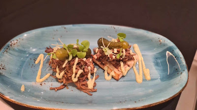 הר של בריסקט מפורק - בשר מפורק מונח על לחם קסטן ואיולי כוסברה- מנה מפונפנת שכל כך טעימה, ממש בדיוק כמו שהיא נראית . פרוסות קטנות של לחם קסטן צרוב ועליהם מונח לו הר של בריסקט מפורק וטעים. גם כאן התיבול מוקפד, מאוזן- בכל ביס תרגישו את כלל המרכיבים אשר משתלבים להם בהרמוניה מופלאה: